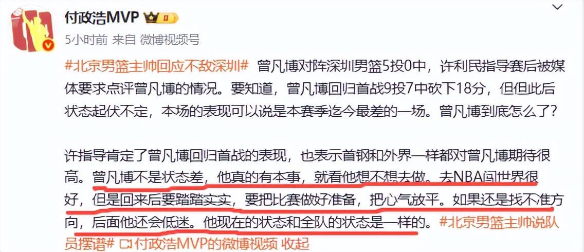 显而易见,谈到曾凡博时,许利民不是表扬他,而是批评他,那么许利民前面痛批的明星球员摆谱、耍大牌,应该指的就是曾凡博。当然记者没有叫许利民谈周琦的表现,不谈周琦的表现,不等于不批评他。许利民的震怒,在我看来不只是单单指向曾凡博,同时还包含了连续两场表现拉胯的周琦。你们说呢?